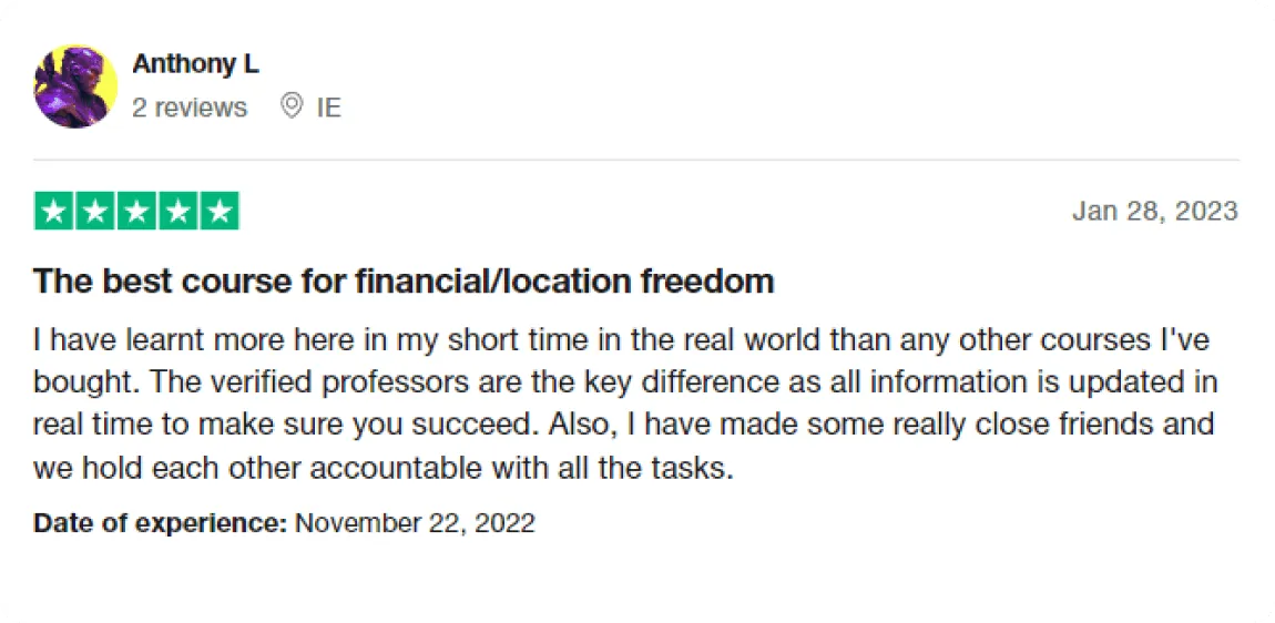Each of our professors have made over $1M USD profit using the methods they teach inside of our curriculum.